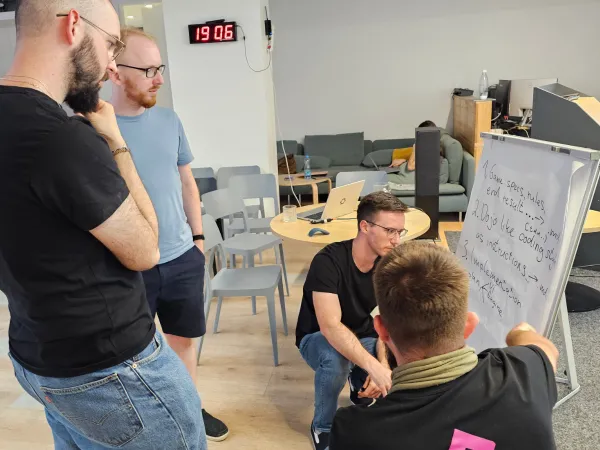 A coding dōjō is where developers practice together. We set ourselves a challenge and tackle it as a group—one person driving at the keyboard, others navigating, everyone learning.